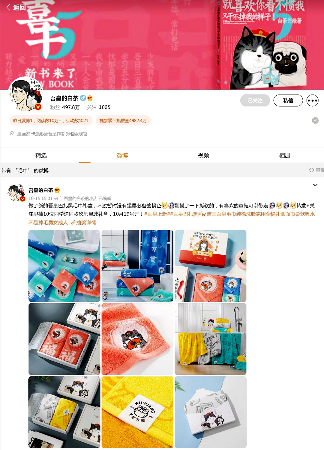 2021年1015日,漫畫家、卡通形象吾皇作者“吾皇的白茶”發布微博,稱“做了新的吾皇巴扎黑毛巾禮盒,不過暫時沒有猛男必備的粉色,剛摸了一下挺軟的,有喜歡的童鞋可以帶走”,配圖赫然正是孚日集團攜手“吾皇萬睡”新推出的傲嬌巾品。